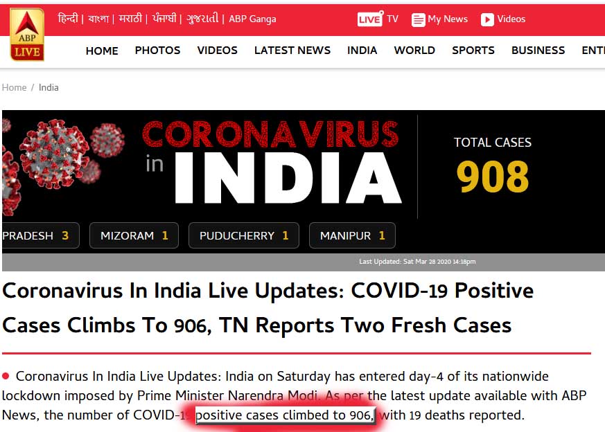 Presently, it is good to see that ABP News has corrected the line and refreshed it as, "As per the latest update available with ABP News, the number of COVID-19 positive cases climbed to 906, with 19 deaths reported."