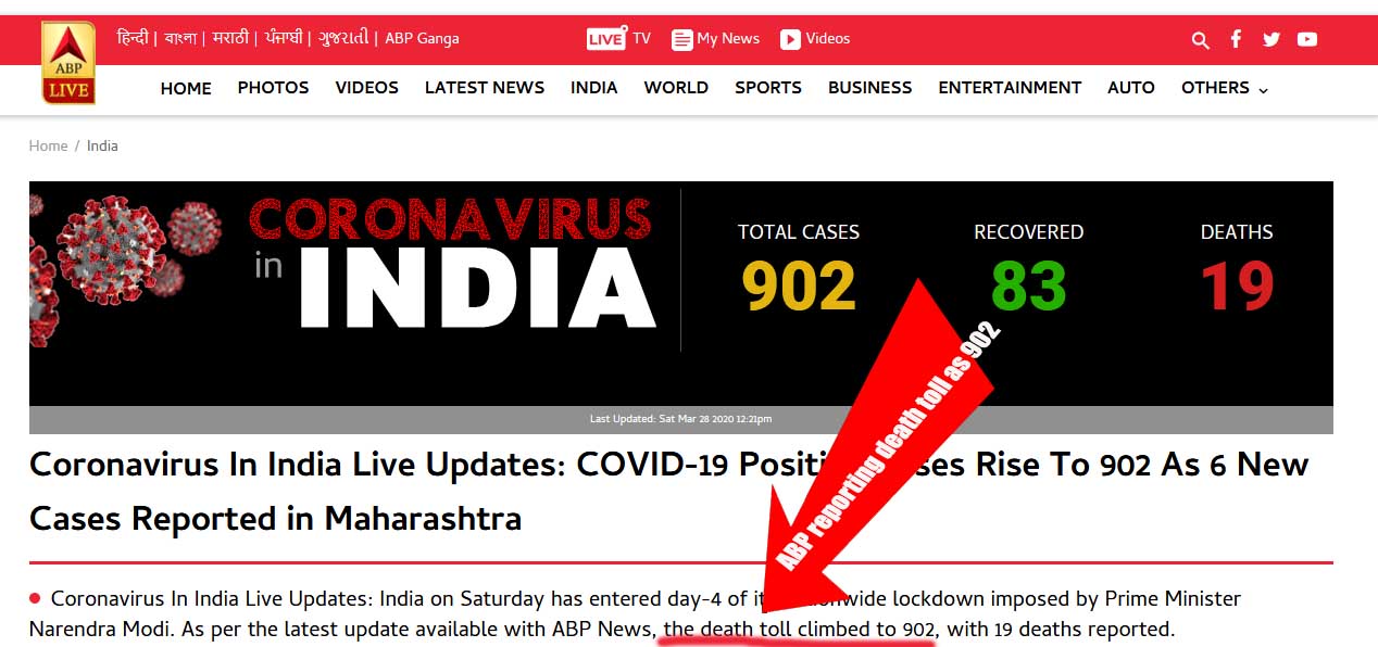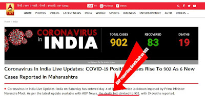India, 28th March, 2020: Corona updates regarding number of active cases, death rates, recovery rates etc. are very necessary data for viewers and in order to help the viewers India's news sites have been updating it regularly. But sometimes some sort of discrepancies appear. India's leading News Channel ABP News today updated in its website figures relating to Corona's death toll with misstated fact. At about 1:14 PM today, the ABP News Website news.abplive.com displayed, "As per latest update available with ABP News, the death toll climbed to 902,..."![]() |