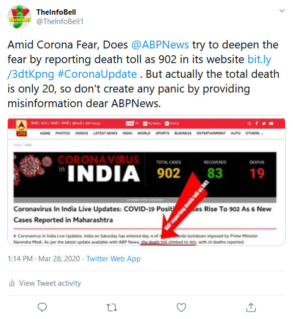 But actually till midday today, total cases of Corona Patients rose to 902 and death figure stood only at 20. The ABP News online news portal did a blunder while publishing that news. So, the Infobell decided to take on the issue and tweeted the screenshot of the news. Theinfobell just wants to remind the mistake because such mistake may even lead to a chaotic situation. These are small mistakes but the results may be drastic.