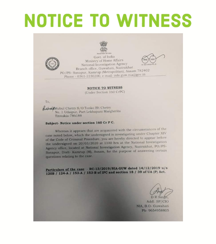 Voice of young generations, Rahul Chetry was surprised to see a summon from NIA yesterday which was primarily printed in the name of Rubul Chetry, who is Rahul Chetry's UAE lived brother. He found that the name of Rubul Chetry has been overwritten with his name and then served to him. In the letter, he is asked to appear at the NIA office located in Sonapur, Guwahati, a very outskirt area from the main city of Guwahati. The letter further reads